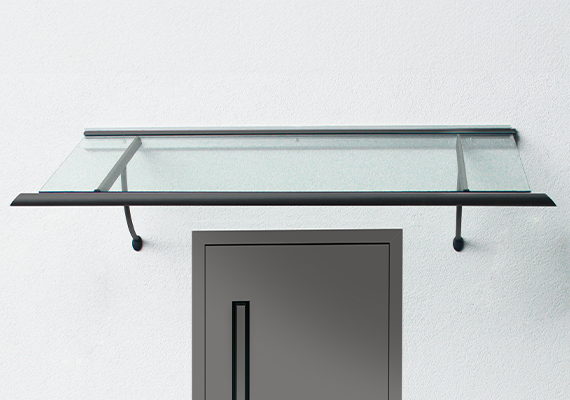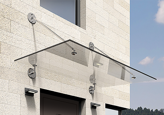 Das Glasvordach Modena von Albohn überzeugt durch eine robuste 16-20 mm starke VSG/TVG-Scheibe, die sicher von Edelstahl-Abhängungen und Wandhaltern getragen wird.